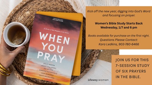 Kick off the new year digging into God's Word and focusing on prayer. Books are available to purchase on the first night. Questions? Please contact Kara Ledkins, 903-780-6466.